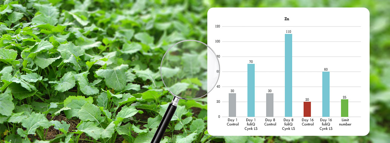- Following application of the foliar fertiliser foliQ® Cynk LS, the zinc levels in leaves increased by over 100% versus the control after one day.